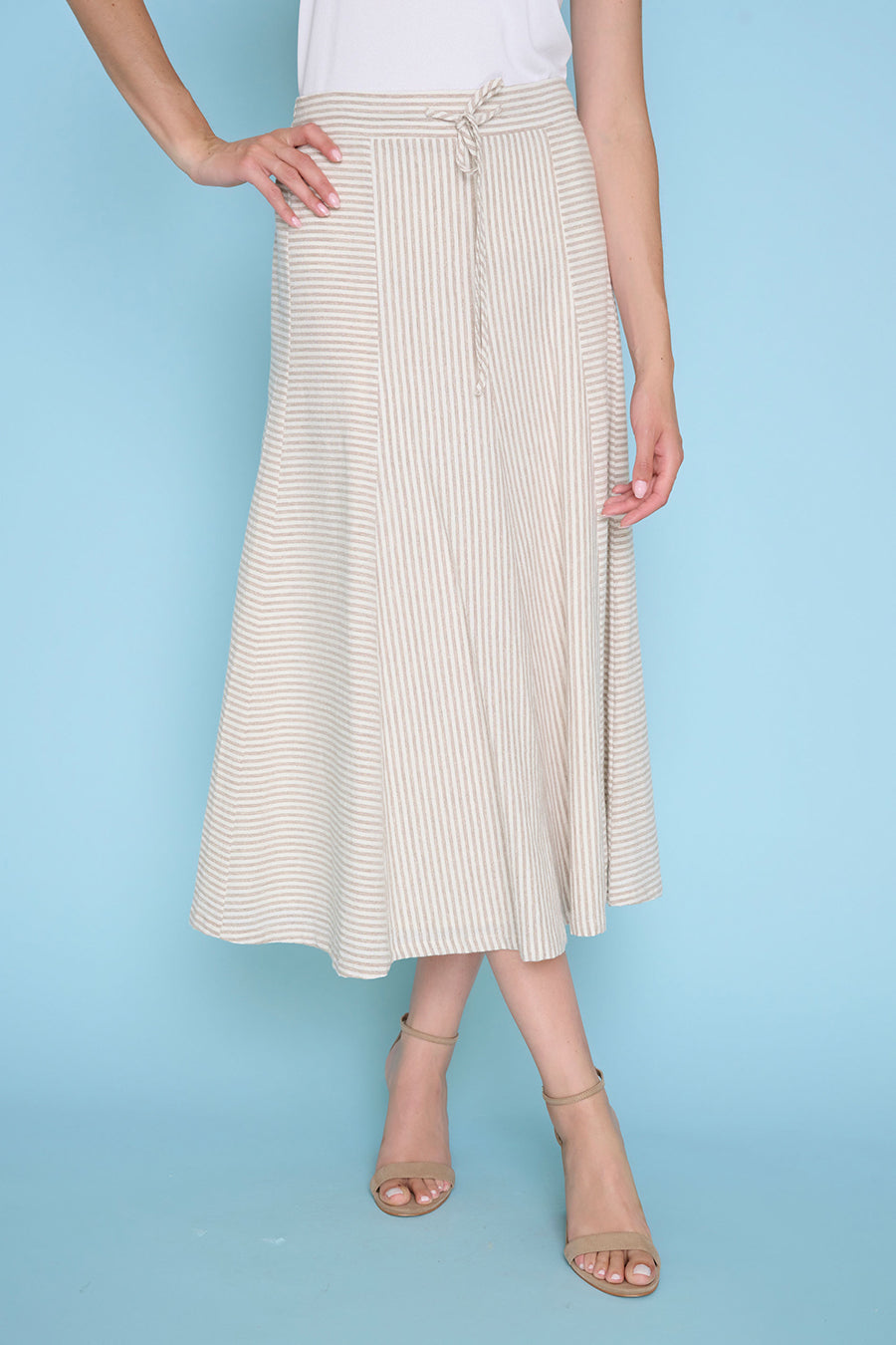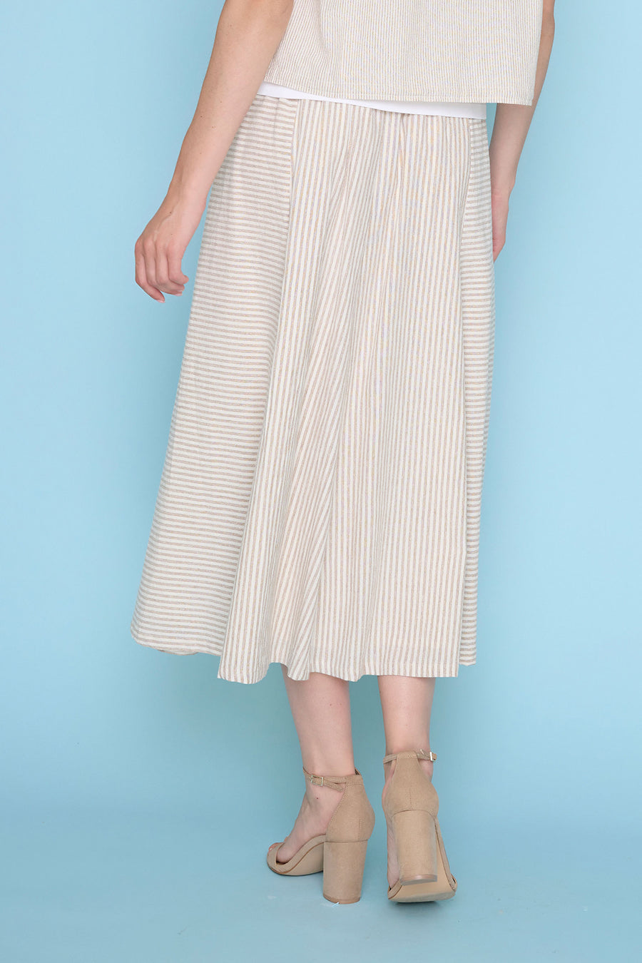 The A-Line Paneled Long Skirt moves with a soft, graceful rhythm thanks to its paneled construction. In striped cotton linen, it feels both grounded and airy - a timeless piece that pairs just as easily with a simple tee as it does with a matching top.