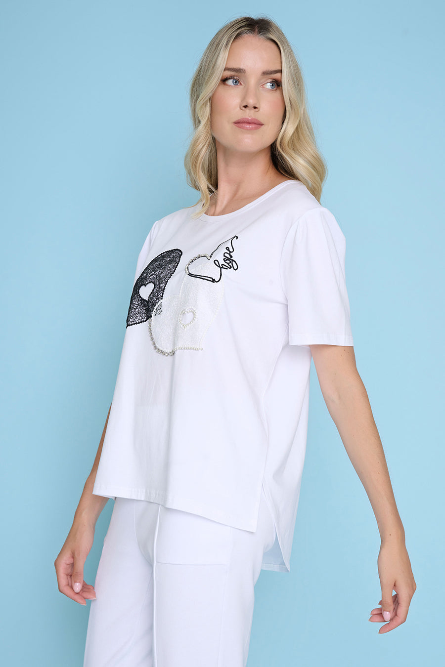 Who can resist a little heart detail? The Heart Embroidered Top blends playful, lace embroidery with a comfortable printed jersey base, creating a cheerful piece that brightens everyday outfits with its sparkling rhinestone and faux-pearl embellishments.