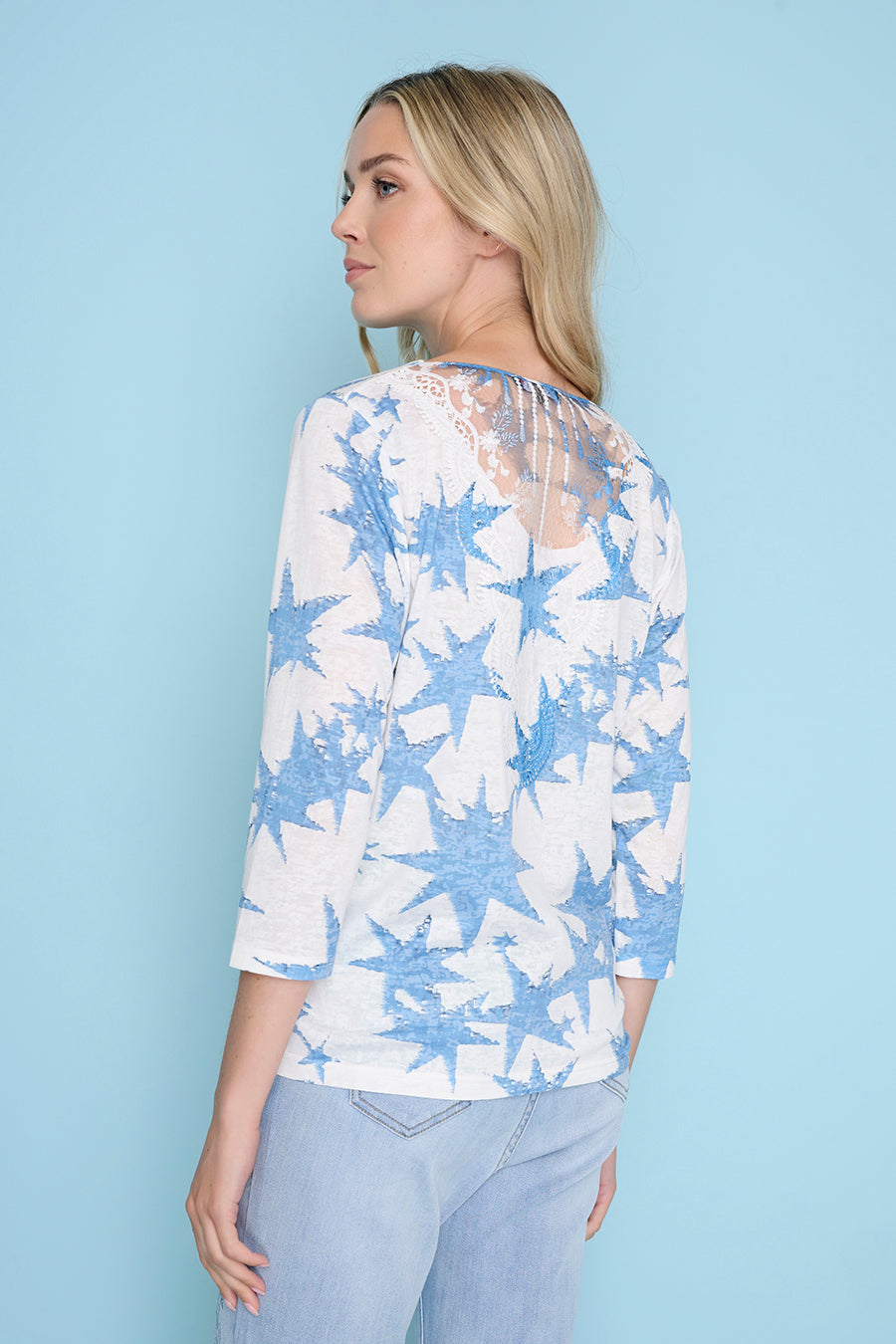 Perfect for soft styling, this V-Neck Star Printed Top combines a flattering neckline with lightweight comfort for warm-weather wear. Featuring a lace insert at the back and a subtle star print that adds personality, this top is smart addition to a Spring wardrobe with its sparkling rhinestones and comfortable shortened sleeves.