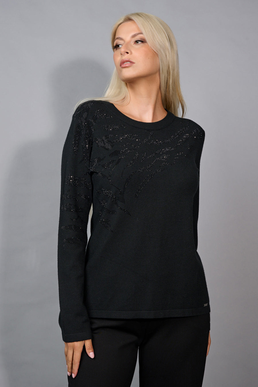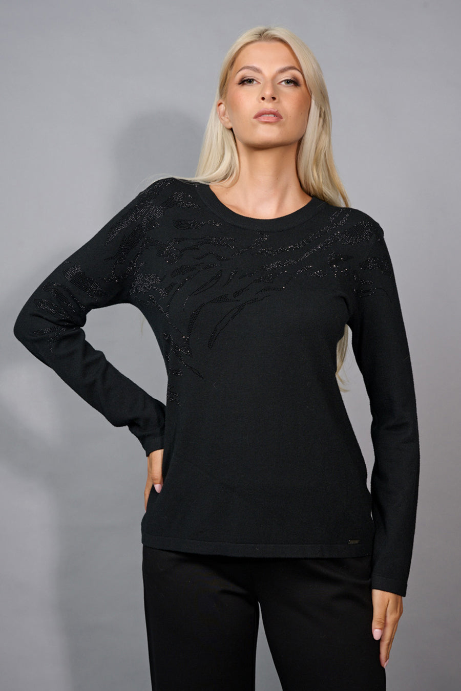 With just the right amount of sparkle, the Tonal Rhinestone Top delivers both comfort and style. Embellished with rhinestones along the neckline and on the sleeves, this cloud-soft sweater-knit top features trending animal print and classic black color for more versatility.