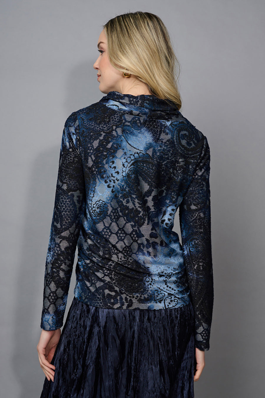 Modern and artsy, the Cowl Neck Asymmetrical Top stands out with its asymmetrical hem and moody blue multi print. The relaxed fit and cozy neckline make it ideal for layering under structured jackets. It’s style and comfort rolled into one.