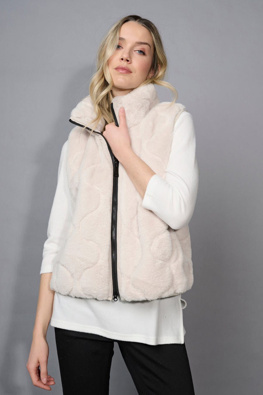 The Faux Fur Zip-Front Vest is plush and warming without feeling bulky. Designed to layer easily, it adds both coziness and texture to sleek base layers. A luxe alternative to the traditional puffer or knit vest.