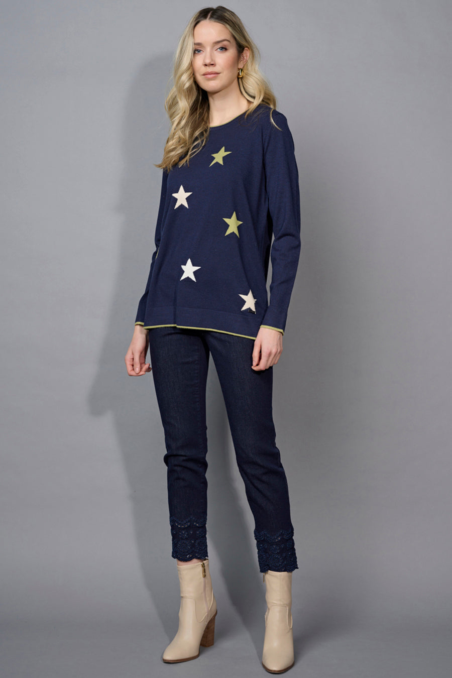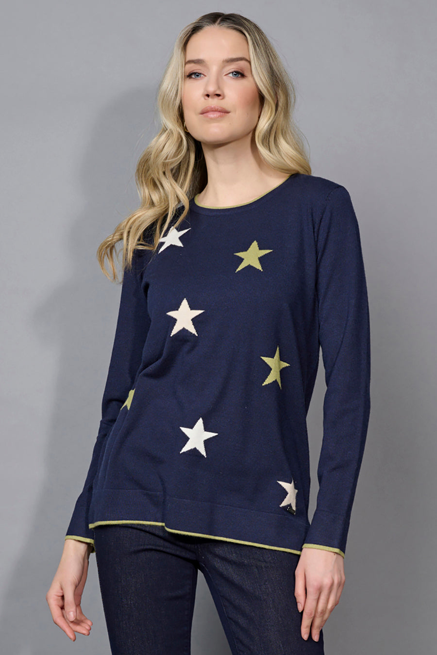 Stand out in the Multi-Star Top! Its navy base sets the perfect backdrop for a scattered star print that’s playful yet polished. Wear it with denim or tuck it into a sleek skirt for an effortlessly fun look.