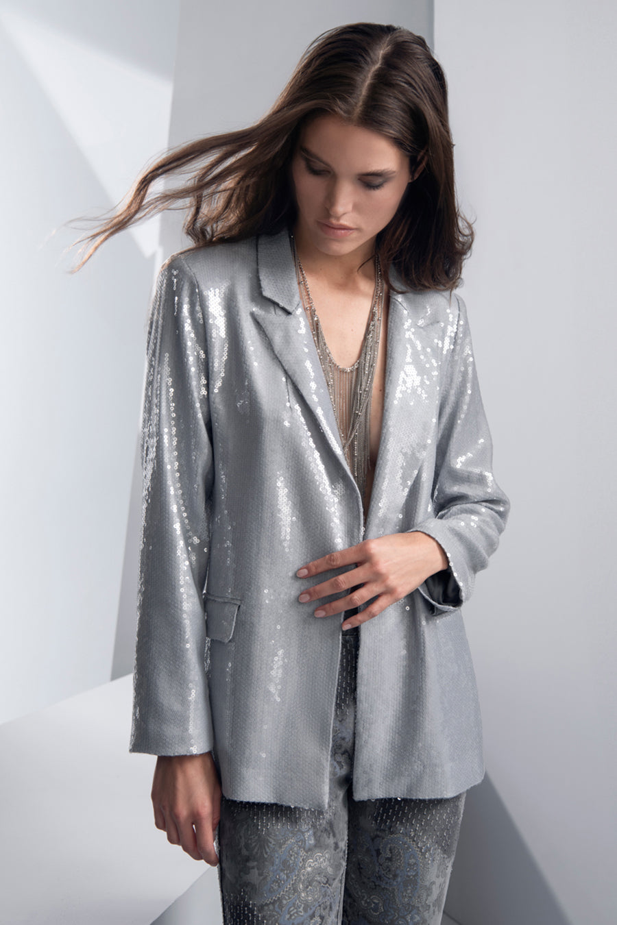 Experiment with this Sequined Blazer and style it with a pair of shiny leggings and high-heeled pumps.