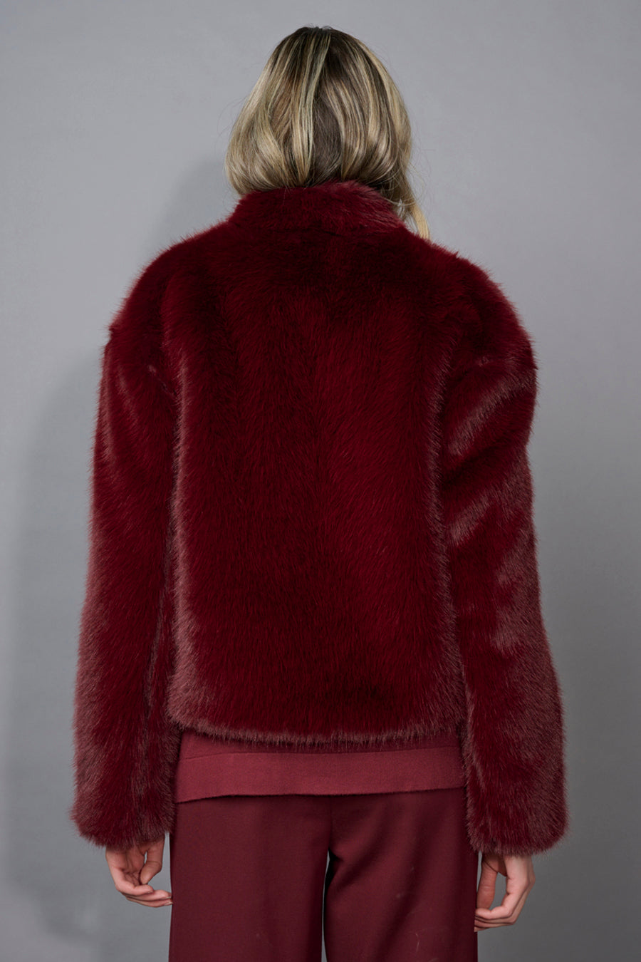 Plush and warm, the Zip-Front Faux Fur Jacket combines softness with structure. The zip-front design and cozy texture make it the ideal cold-weather statement layer in this season’s staple Bordeaux tone.