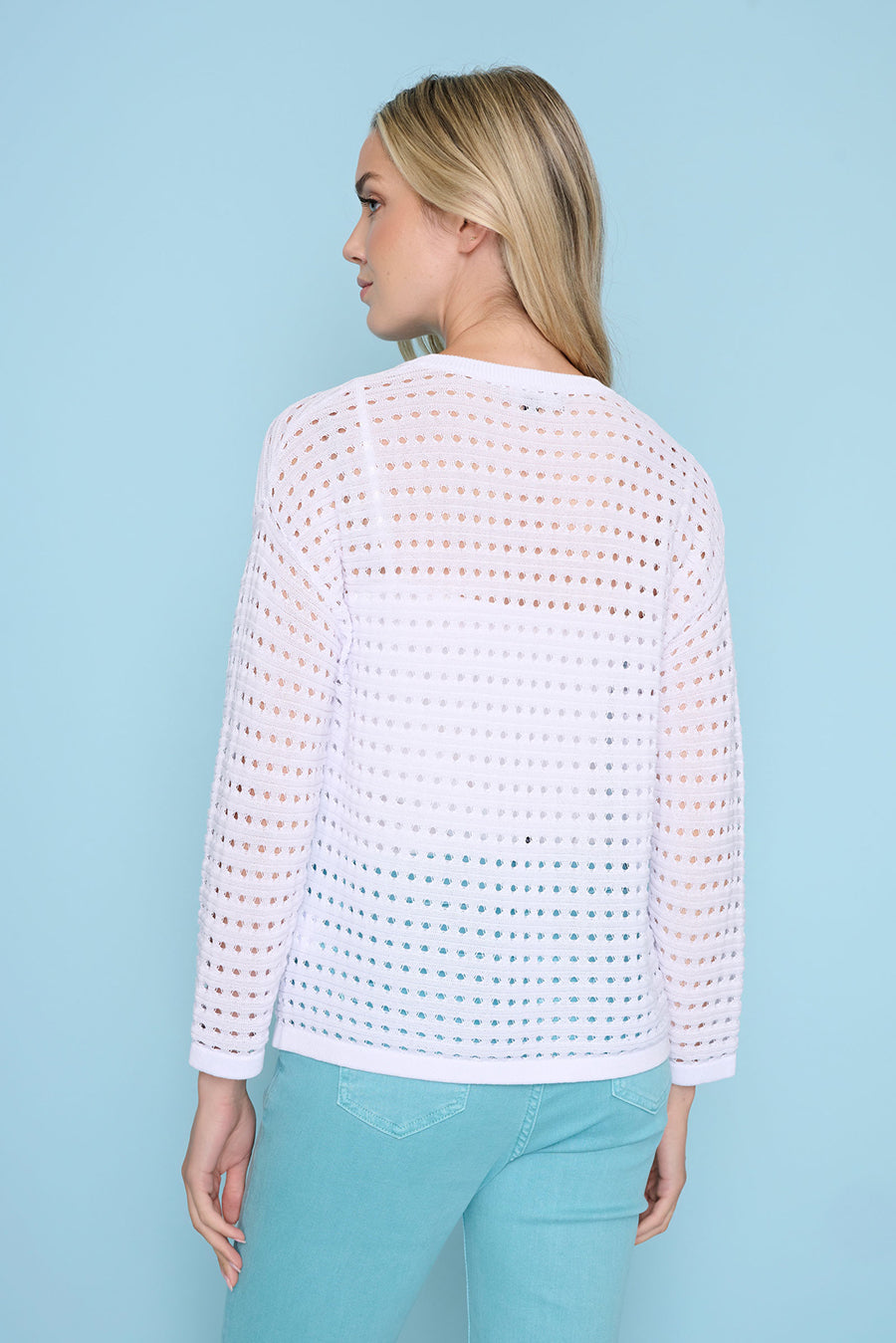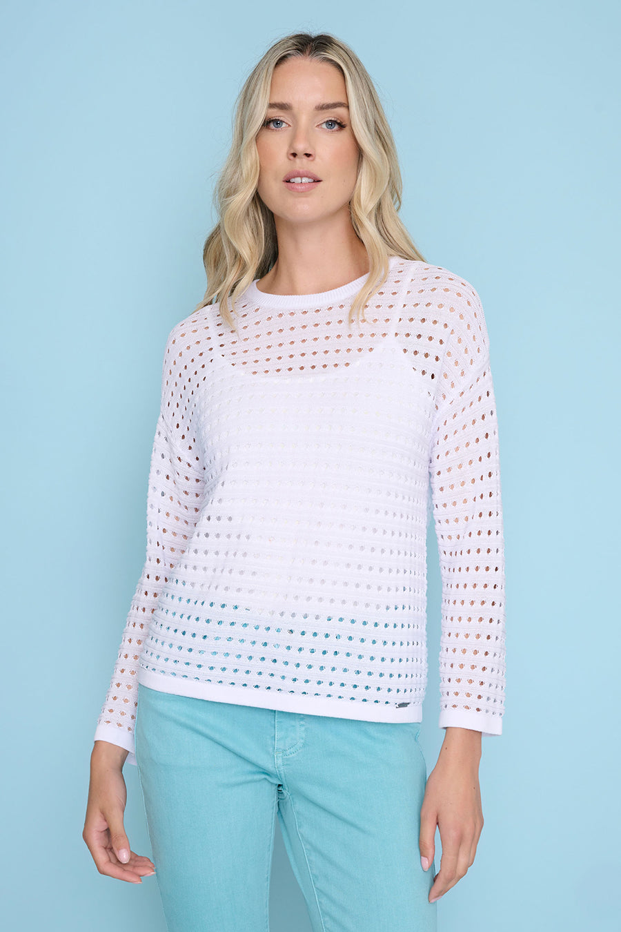 Style the 3/4 Sleeve Open Knit Top with Embellished Ankle-Length Cuffed Jeans.
