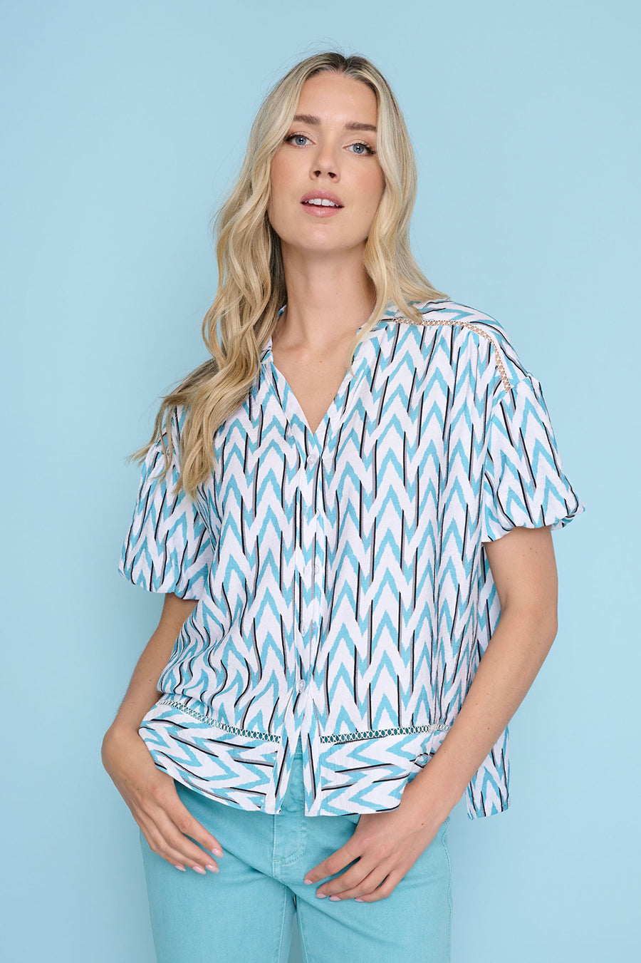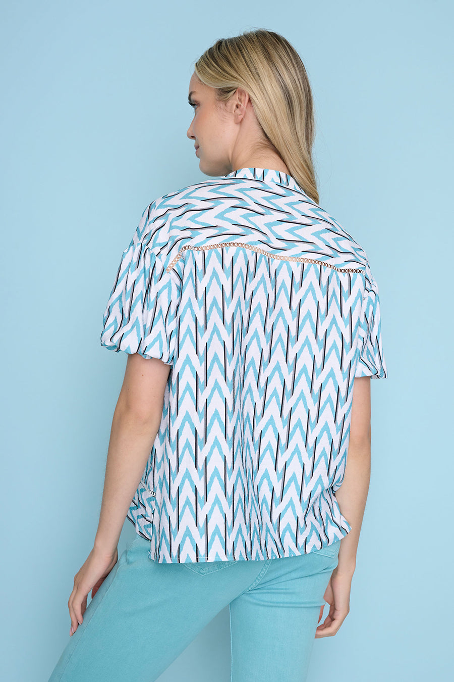 Made from zigzag printed crepe, the Button-Front Puff Sleeve Top delivers personality without overwhelming the silhouette. Softly voluminous sleeves add charm and movement, while the button-front design keeps the look polished and wearable.