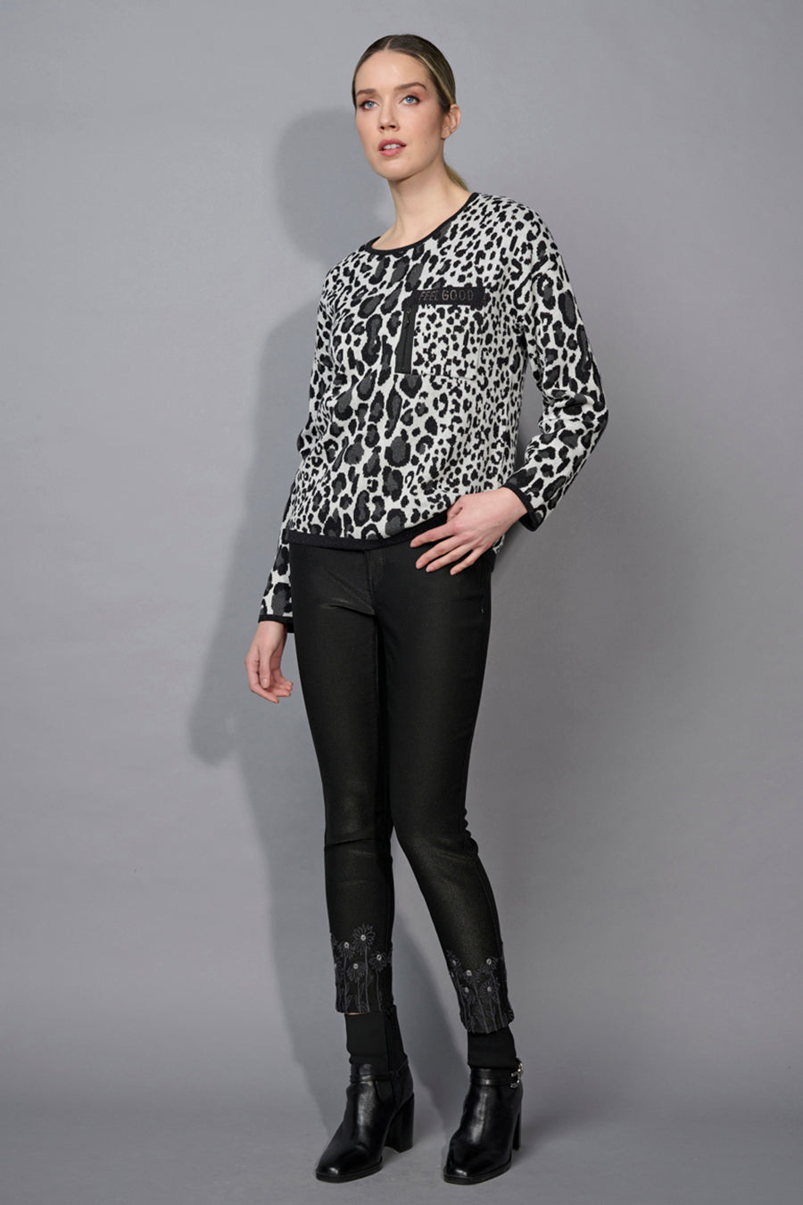 We will wear these Embroidered Slim-Leg Ankle Pants with our brand-new Diamond Cable Top in one of the seasonal colors.
