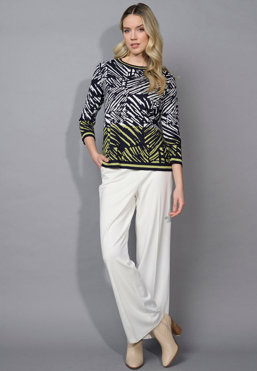 Style this 3/4 Sleeve Abstract Printed Top with a pair of Pull-On Straight Leg Pants in Off-White color – a casual yet stylish look that will never disappoint!