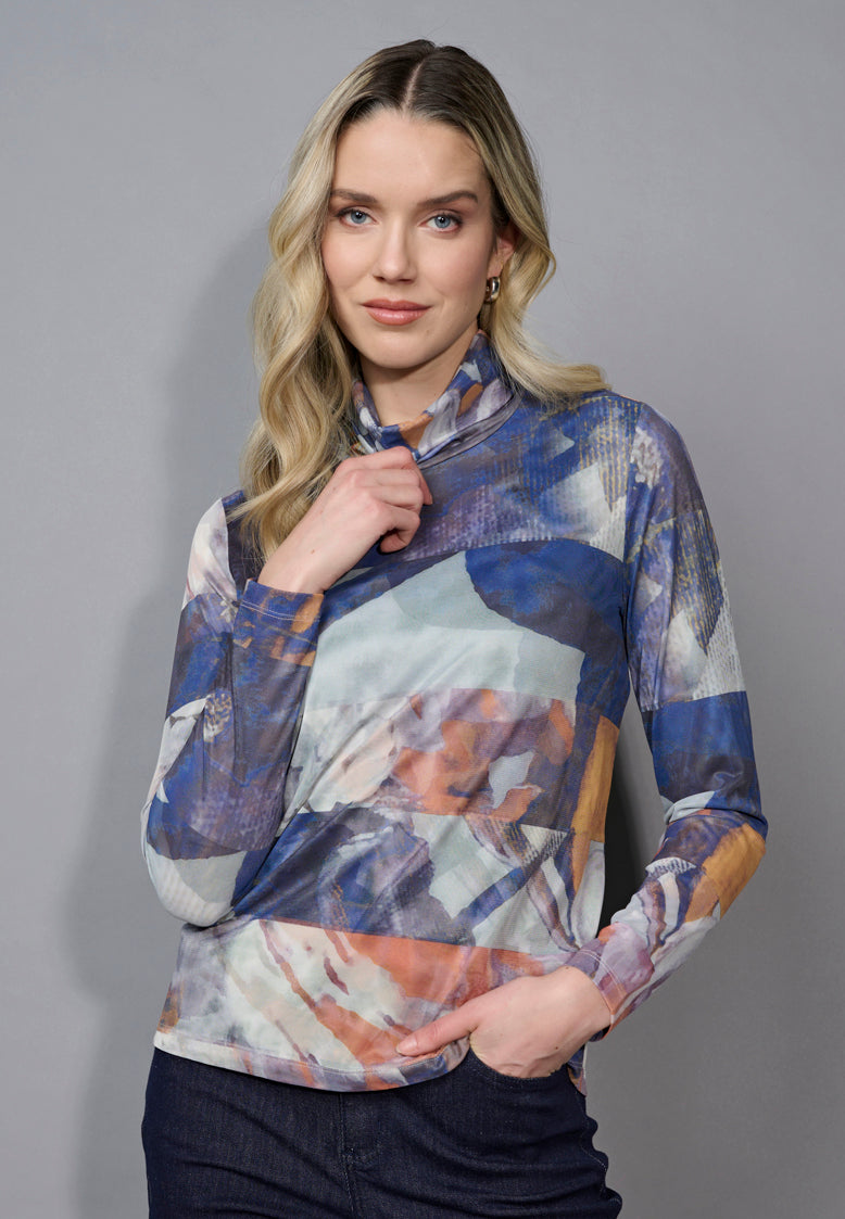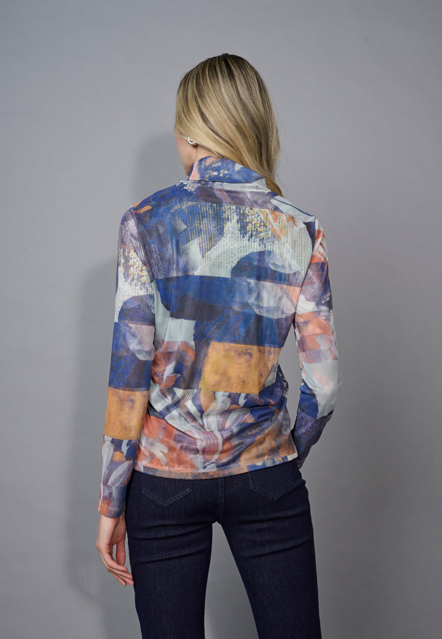 Mock-Neck Printed Mesh Top